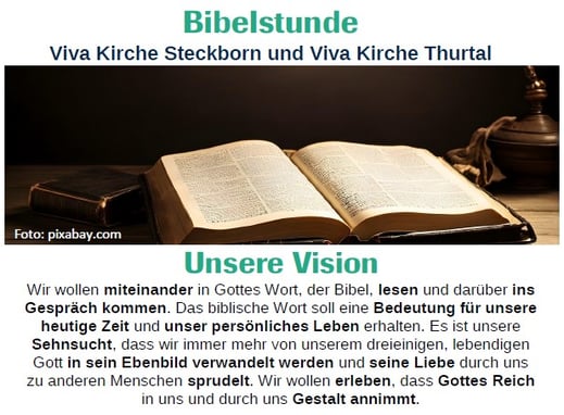 14 täglich am Dienstagvormittag, 09:30 - ca. 10:30h lesen wir mit einander im Buch der Bücher und wollen verstehen, was dies für unser heutiges Leben bedeutet.